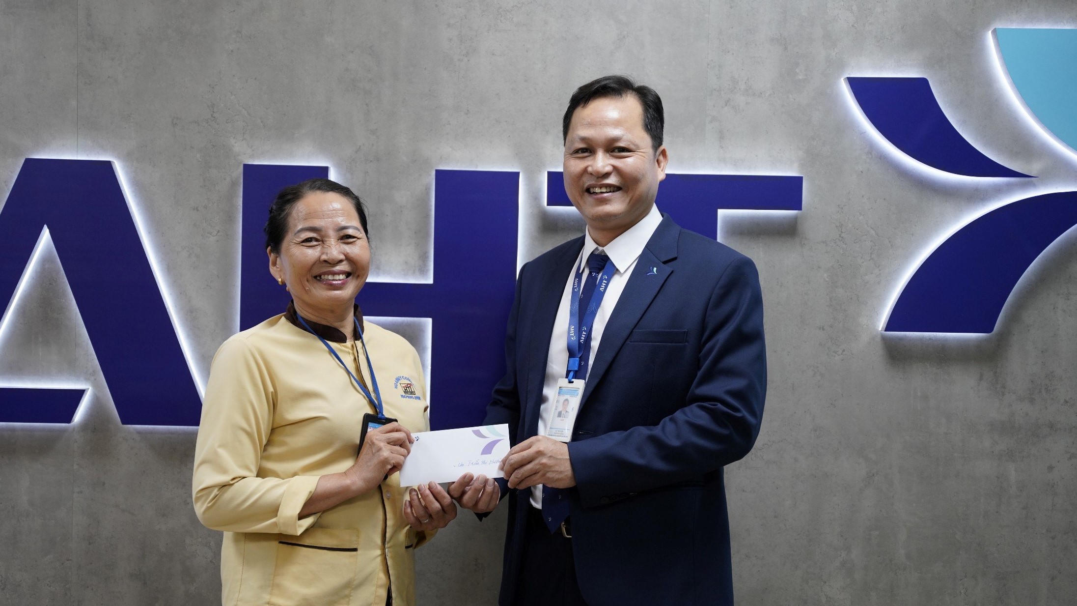 Đại diện Công ty Cổ phần đầu tư khai thác Nhà ga quốc tế Đà Nẵng trao thưởng cho bà Hường. |