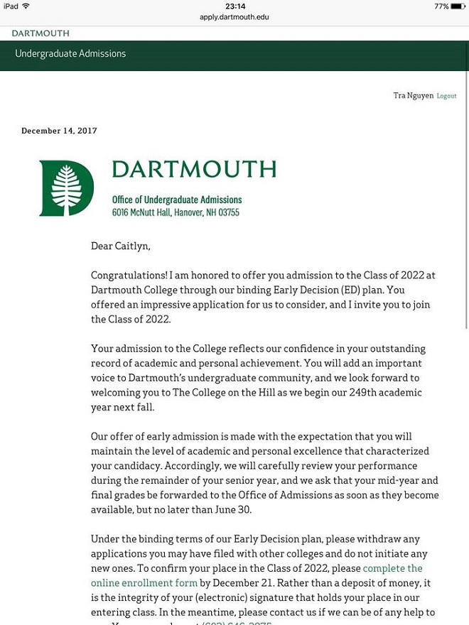 Nguyễn Thị Hương Trà (cựu học sinh chuyên Anh, trường THPT Quốc gia Chu Văn An) vừa được Dartmouth College, thuộc top 8 trường đại học khối Ivy League, hay còn được biết đến là một trong những trường đại học danh tiếng nhất nước Mỹ chấp nhận trợ cấp học bổng và hỗ trợ tài chính lên tới 260.000 USD, tương đương khoảng 6 tỷ đồng cho 4 năm học.