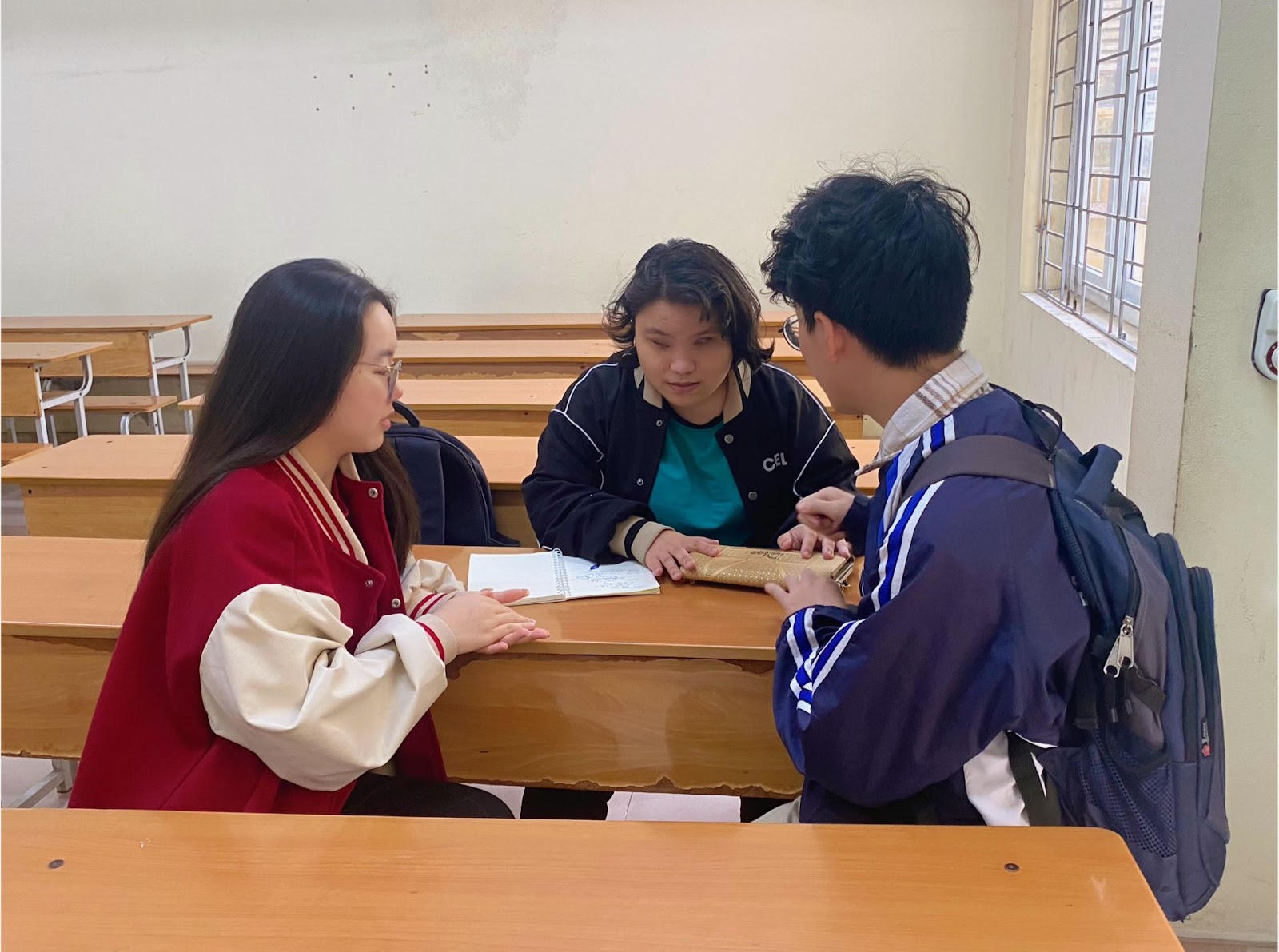 | Phương Anh cùng bạn bè trao đổi về bài học sau tiết học. (Ảnh: Yến Nhi) |