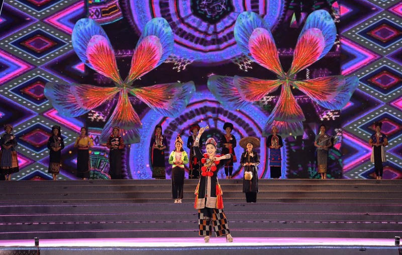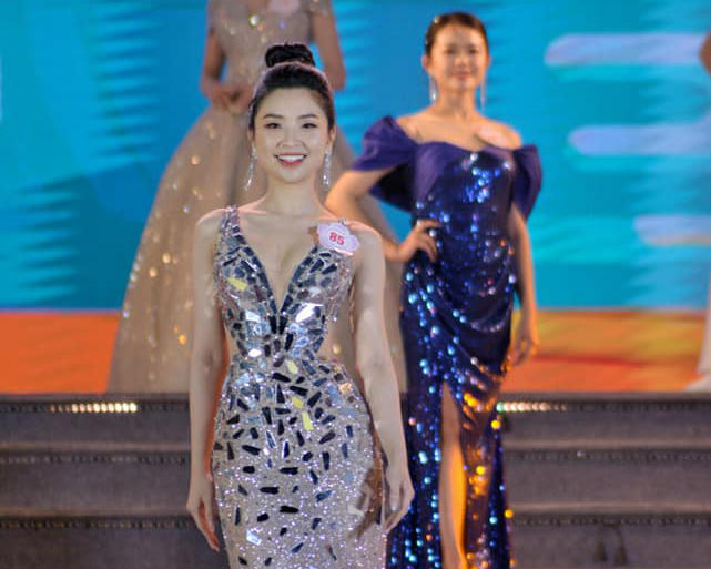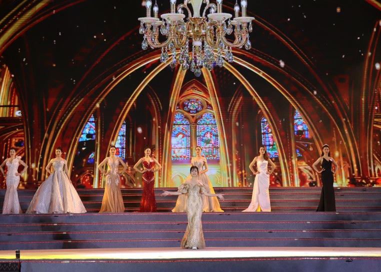 Mở màn đêm chung kết, trong không gian sân khấu hiện đại, rực rỡ sắc màu, các thí sinh đã biểu diễn 2 bộ áo dài thiết kế họa tiết hoa ban và bộ áo dài “Điện Biên miền di sản”.