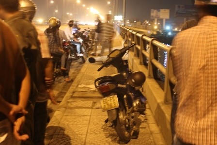 “Vào khoảng 20h tối 28/5, tôi đang đi bộ trên cầu thì thấy một đôi nam nữ chạy xe lên cầu. Cả hai khóa cổ xe rất cẩn thận, người con gái còn cởi áo khoác và rút tiền trong túi ra, đặt chiếc điện thoại lên trên. Tôi đoán cả hai đang đứng hóng gió nên không để ý lắm. Chỉ 5 phút sau, bất ngờ hai người này thì thầm điều gì đó, nắm tay nhau và trèo lên lan can nhảy xuống sông, tôi hét lên ngăn cản nhưng không kịp”.