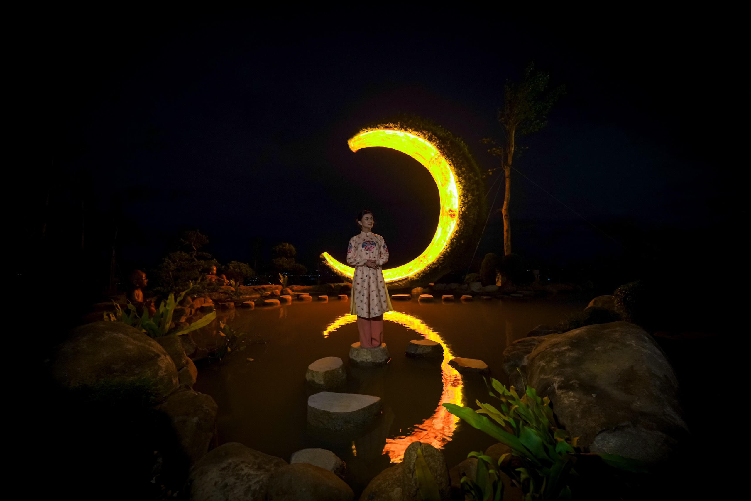 Đêm về, đỉnh núi Bà Đen là một cõi mộng cảnh với hàng vạn ánh sáng lung linh từ hệ thống chiếu sáng mỹ thuật được tạo nên từ 3.500 ngọn đèn led. Vầng trăng khuyết khổng lồ cùng rất nhiều mô hình đèn mặt trăng kích thước khác nhau hội tụ cùng các đèn đom đóm năng lượng mặt trời, tạo nên một khung cảnh huyền bí cho đỉnh núi thiêng. “Vầng trăng khuyết khổng lồ tại Khu vườn Vô Ngã là điểm check-in được rất nhiều du khách thích thú, bởi từ đó du khách vừa có thể ngắm toàn cảnh mây trời bồng bềnh, vừa có cảm giác an yên, thoát tục hiếm nơi nào có được” - nhân viên Sun World Ba Den Mountain chia sẻ. (Ảnh: Nguyễn Minh Tú)