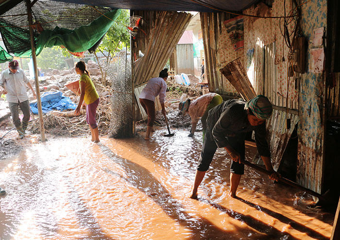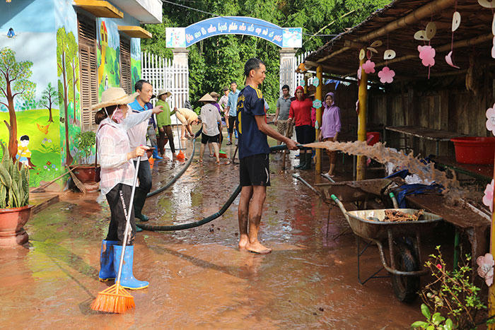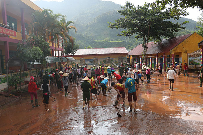 Lực lượng vũ trang, nhân dân chung tay dọn bùn đất tại Trường PTDT Bán trú Tiểu học Chà Nưa.
