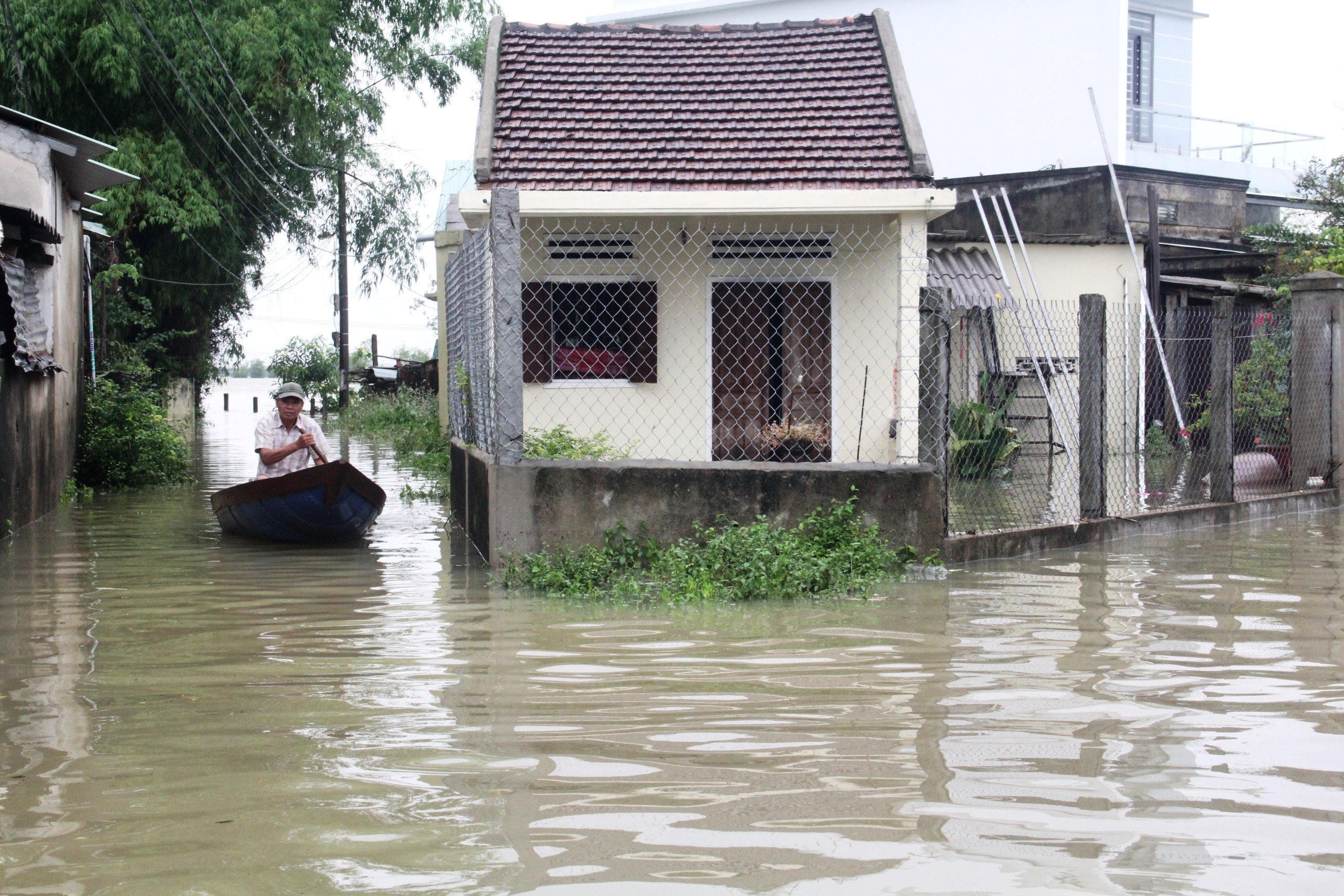 Nhiều khu dân cư ở huyện Phú Ninh bị ngập sâu nửa mét trong nước lũ. |