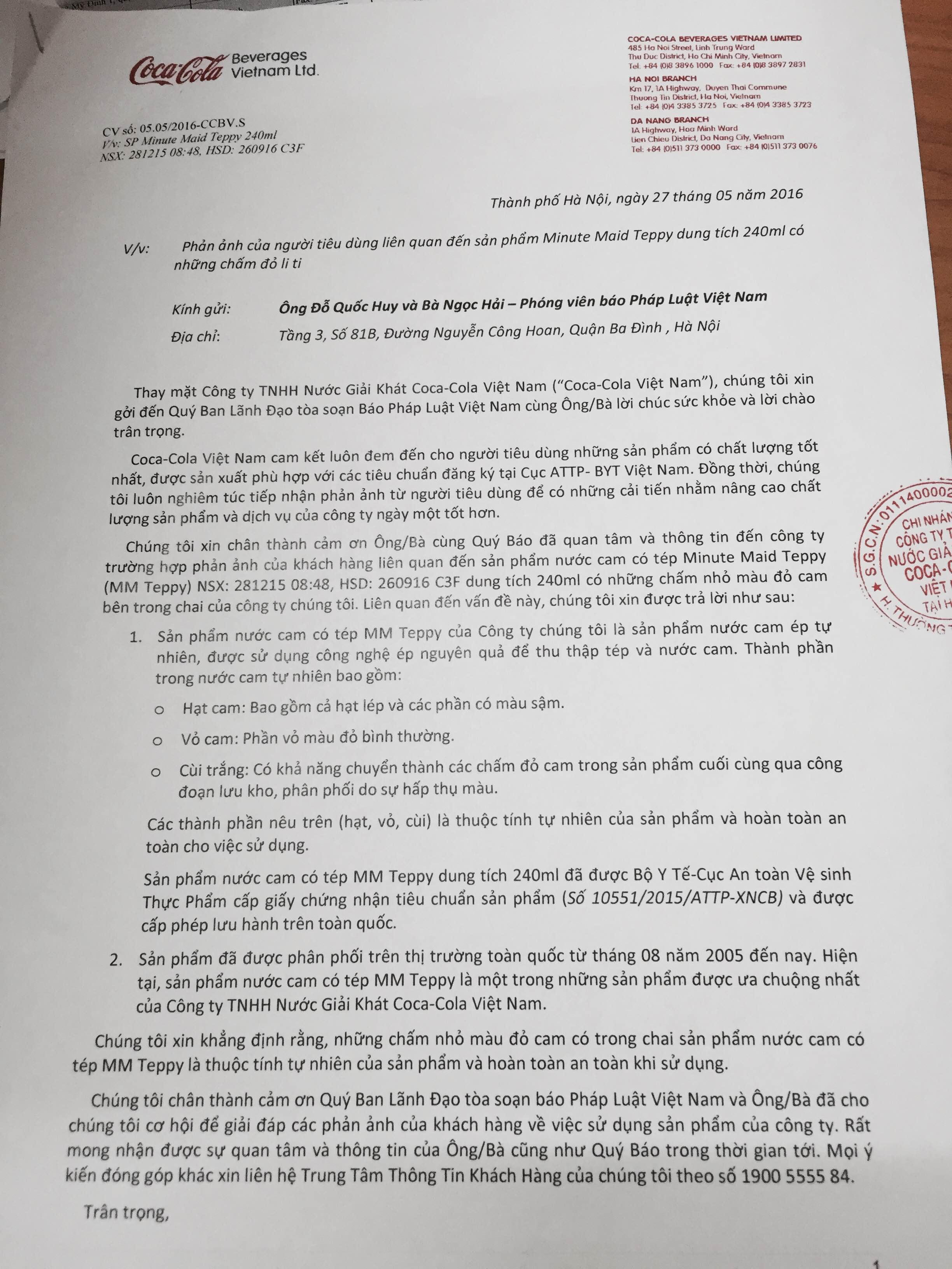 Theo đó, tại công văn số 05.05/2016-CCBV.S, ông Phạm Hữu Trí – Giám đốc Chuỗi Cung Ứng Miền Bắc, đại diện Cty TNHH nước giải khát CocaCola Việt Nam cho biết: “Sản phẩm nước cam có tép Minute Maide Teppy là nước cam ép tự nhiên, được sử dụng công nghệ ép nguyên quả để thu thập tép và nước cam. Thành phần trong nước cam tự nhiên bao gồm: Hạt cam (cả hạt lép và các thành phần có màu sậm) ; vỏ cam (phần vỏ màu đỏ bình thường); cùi trắng (có khả năng chuyển thành các chấm đỏ cam trong sản phẩm cuối cùng qua công đoạn lưu kho, phân phối do sự hấp thụ màu) ”