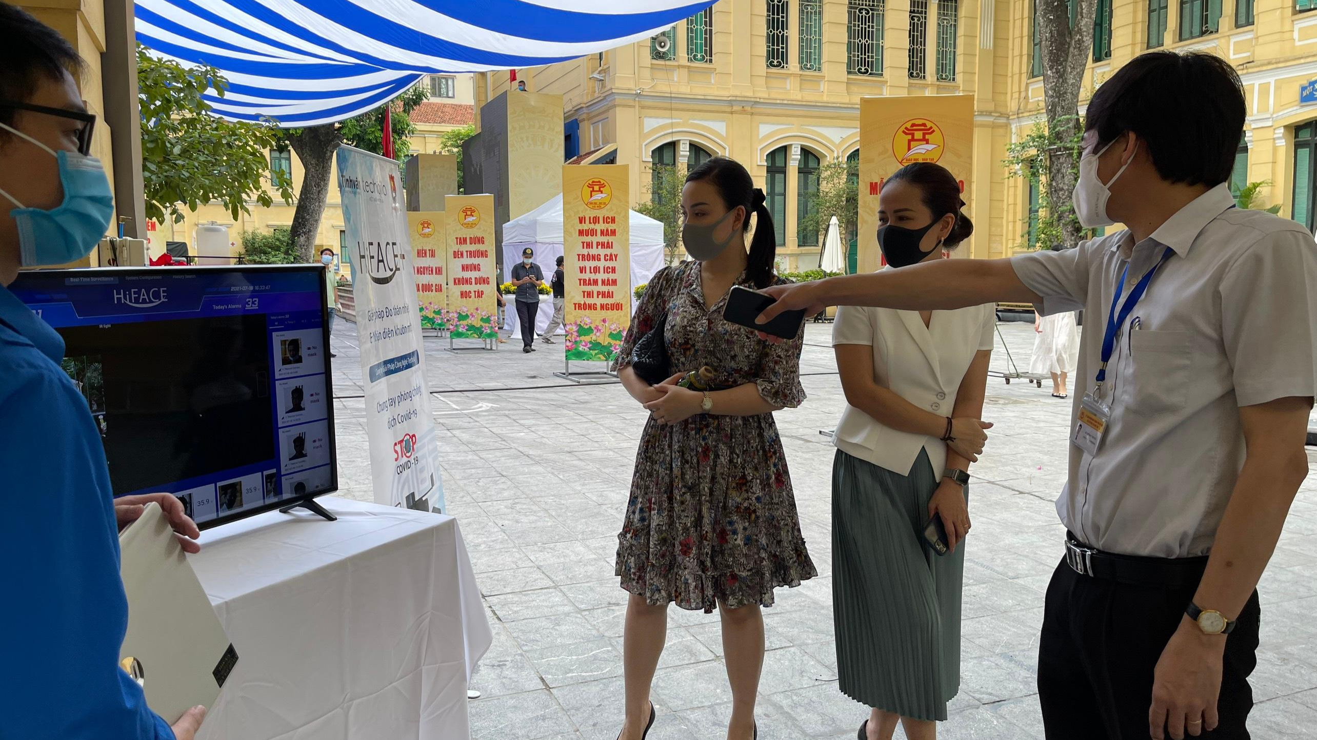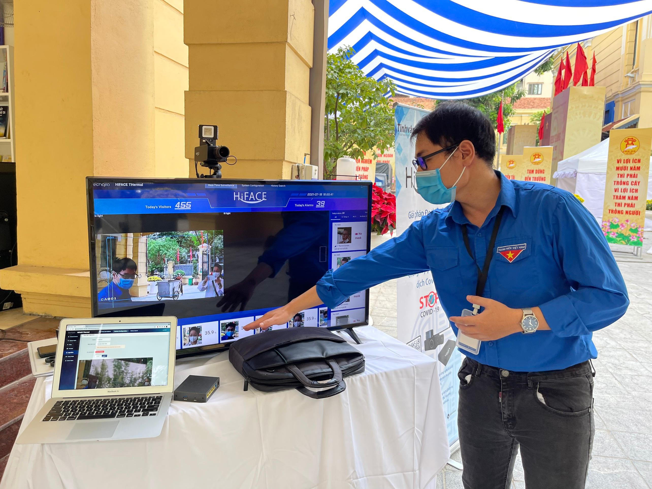 Đây là phần mềm đo nhiệt độ thông minh, các đại biểu và các học sinh tham gia Khai giảng đều phải kiểm tra nhiệt độ trước khi vào tham dự. Ảnh: Mỵ Châu |