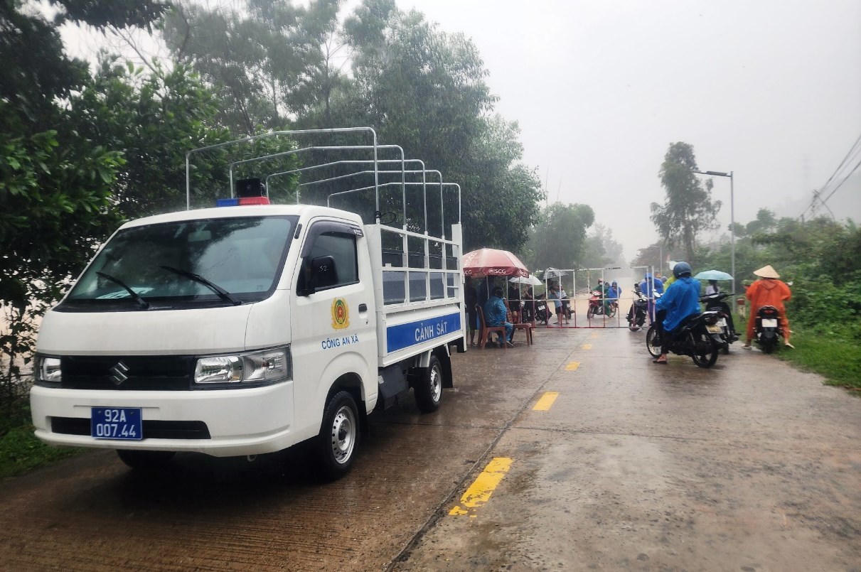 Lực lượng chức năng lập barie ngăn các phương tiện đi qua vùng nước lũ chảy xiết.