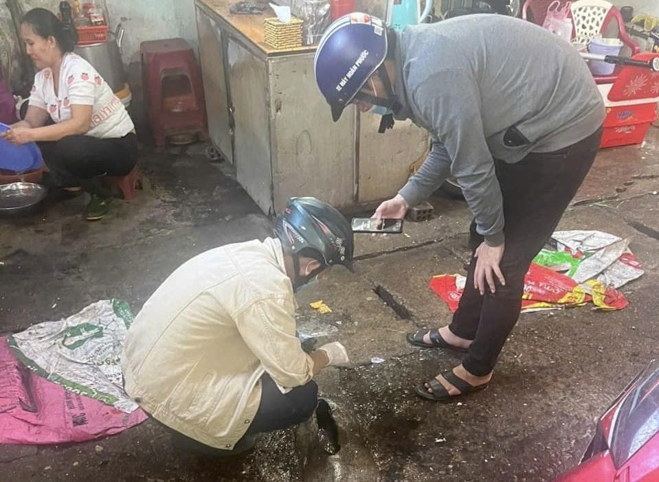 Cơ quan chức năng lấy mẫu nước thải ở chợ Quảng Ngãi để kiểm tra vào tháng 8/2024. |