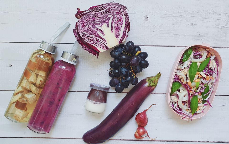 Món gỏi gà Việt Nam phiên bản sịn sò với bắp cải tím. Sinh tố Nho với thanh long (Ảnh: Khương Phạm)