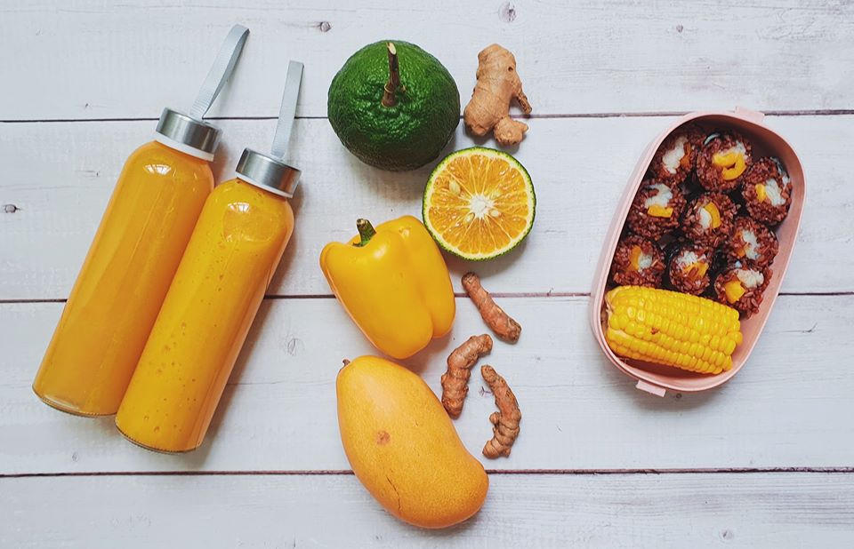 Nước cam với nghệ. Nước xòai với gừng nhiều chất xơ đánh bay mỡ bụng dưới. Sushi gạo lức với ức gà bao no mà không sợ mập... Cuốn thêm ớt chuông cho bổ toàn thân. (Ảnh: Khương Phạm)