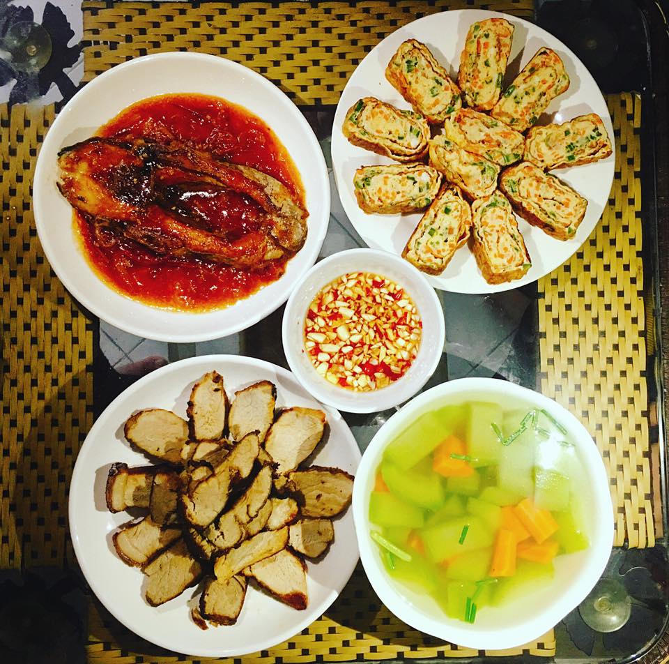 Chuẩn cơm nhà mẹ nấu với đủ các món canh, mặn, sào (Ảnh: Triệu Tuyết Trinh)