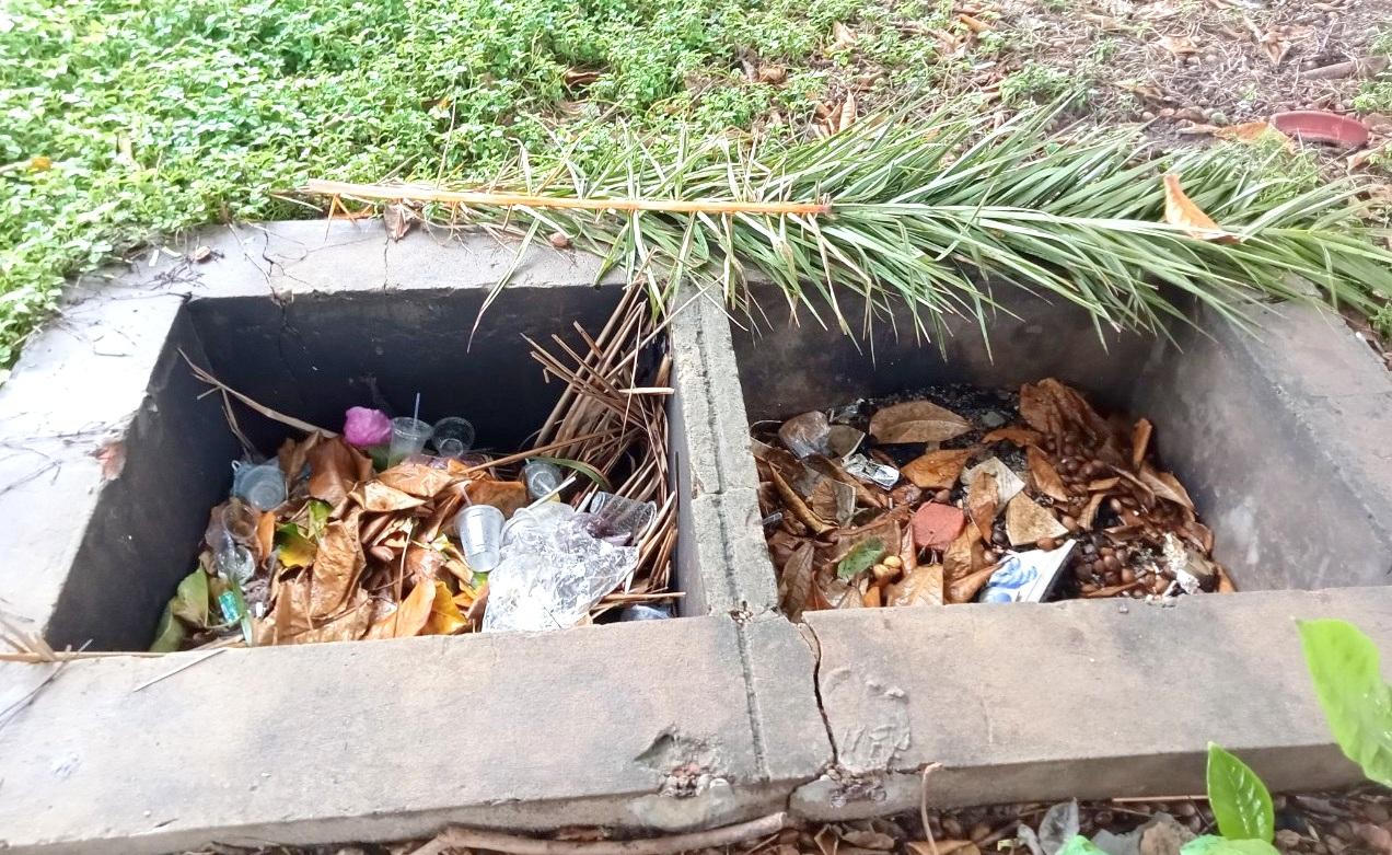 Nhiều hố rác xuất hiện bên trong bồn hoa. |