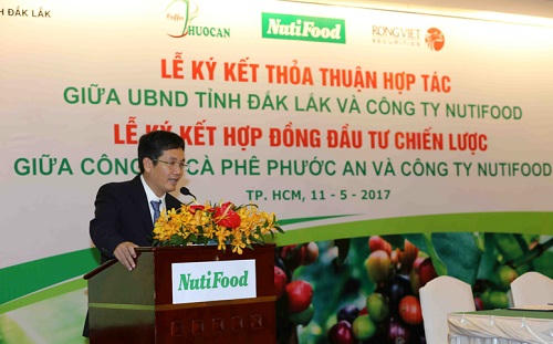 Ông Nguyễn Tuấn Hà – Phó Chủ tịch UBND tỉnh Đắk Lắk phát biểu: “Tỉnh Đắk Lắk có điều kiện tự nhiên thuận lợi để phát triển nông nghiệp, đóng góp 50% sản lượng cà phê cho cả nước. Chính phủ cũng như UBND tỉnh đã có chủ trương, chính sách xây dựng ngành cà phê phát triển bền vững, gia tăng giá trị trên cơ sở ứng dụng công nghệ cao, nên khi Cty NutiFood là doanh nghiệp có chức năng nghiên cứu và sản xuất dinh dưỡng, nhiều năm kinh nghiệm trong lĩnh vực sản xuất sữa muốn đầu tư nông nghiệp công nghệ cao vào địa phương, chúng tôi đã nhất trí ngay”.