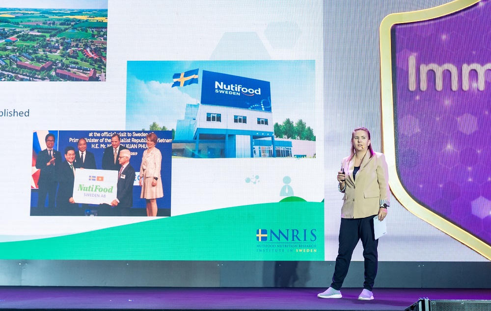 Bà Ylva Minör - Giám Đốc Nghiên cứu Phát triển Nutifood Sweden AB và Giám đốc Viện Nghiên cứu Dinh dưỡng Nutifood Thụy Điển NNRIS trình bày tại sự kiện. |
