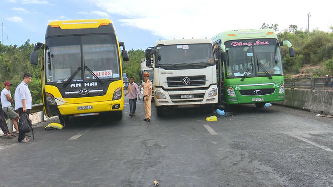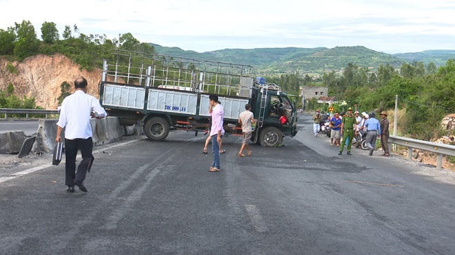 Lúc này, bà Mai Thị Minh Thúy (45 tuổi, ở xã An Cư, huyện Tuy An) đang điều khiển xe máy BKS 78H1 - 131.26 lưu thông cùng chiều với xe tải, nhìn thấy chướng ngại vật nên đã giảm tốc độ để tránh. Tài xế điều khiển xe bồn BKS 77C - 080.29 phát hiện hiện bà Thúy đang tránh xe tải bị nạn nên thắng gấp, dừng xe thì từ phía sau, xe tải đông lạnh BKS 51D - 453.82 lao đến, đâm vào đuôi xe bồn.