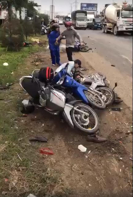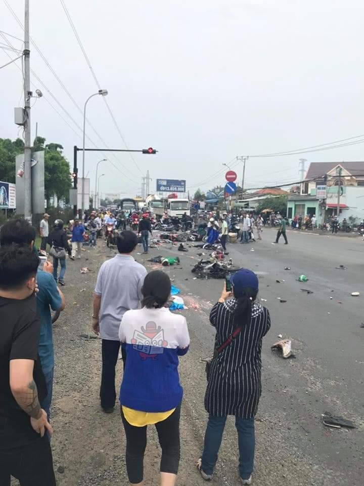 Tại hiện trường, khoảng 20 xe máy bị biến dạng nghiêm trọng. Nhiều xe gãy đôi, nằm xếp chồng lên nhau, dầu nhớt vương vãi. Một số xe kẹt cứng dưới gầm xe container. Tai nạn làm Quốc lộ 1 kẹt xe nghiêm trọng nhiều km, cảnh sát phải hướng dẫn người dân về TP HCM chạy sang làn đường hướng ngược lại. Nhiều ôtô cũng quay lại TP Tân An để lên cao tốc Trung Lương.