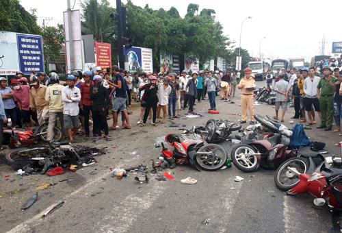 (PLO) - Các xe máy đang dừng trước đèn đỏ đột nhiên bị xe container chạy cùng chiều đâm, khiến 4 người thiệt mạng, 17 người bị thương.