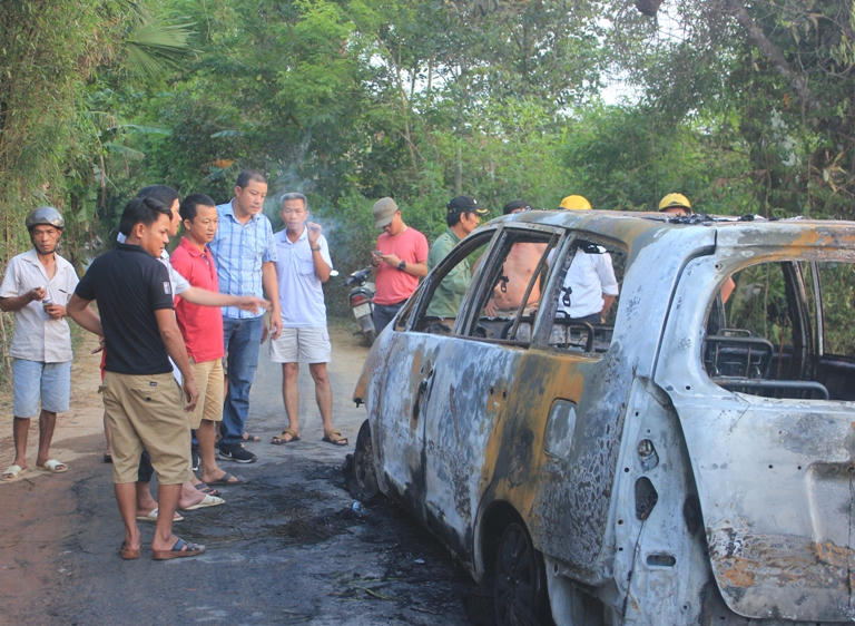 Anh Thành nhanh chóng tấp xe vào lề đường, mở cửa cho 7 thành viên, trong đó có 2 cháu nhỏ dưới 3 tuổi thoát ra ngoài. Khôn lâu sau, toàn xe bùng lửa, để lại hiện trường khung sắt.