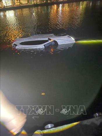 Ô tô lao xuống sông ở thành phố Hải Dương. Ảnh: TTXVN