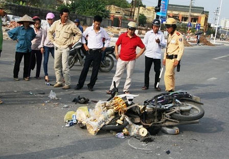 Một số nhân chứng cho biết, chiếc xe tải chở cát đi theo hướng từ cầu Vĩnh Tuy ra QL 5, khi đến công trường, lái xe rẽ sang đường với tốc độ nhanh, đâm phải xe máy đi làn đường bên cạnh.