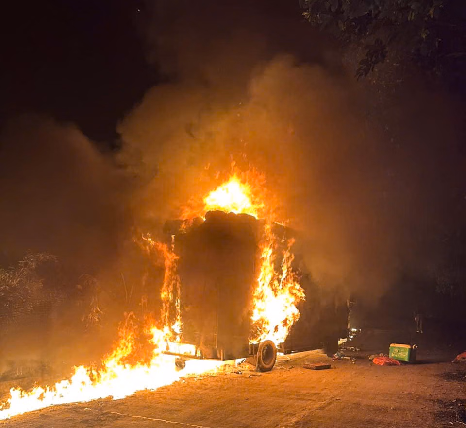Ô tô tải chở hàng cháy rụi trên tỉnh lộ 562 ở Quảng Trị