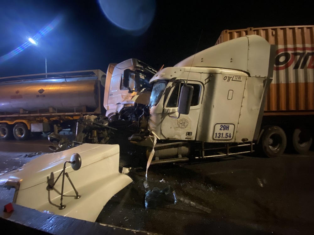 Tại hiện trường, cả 2 xe bị hư hỏng nặng phần đầu, xe bồn mang BKS 29H-817.56 bị lệch chéo choán hết phần đường trên cầu.