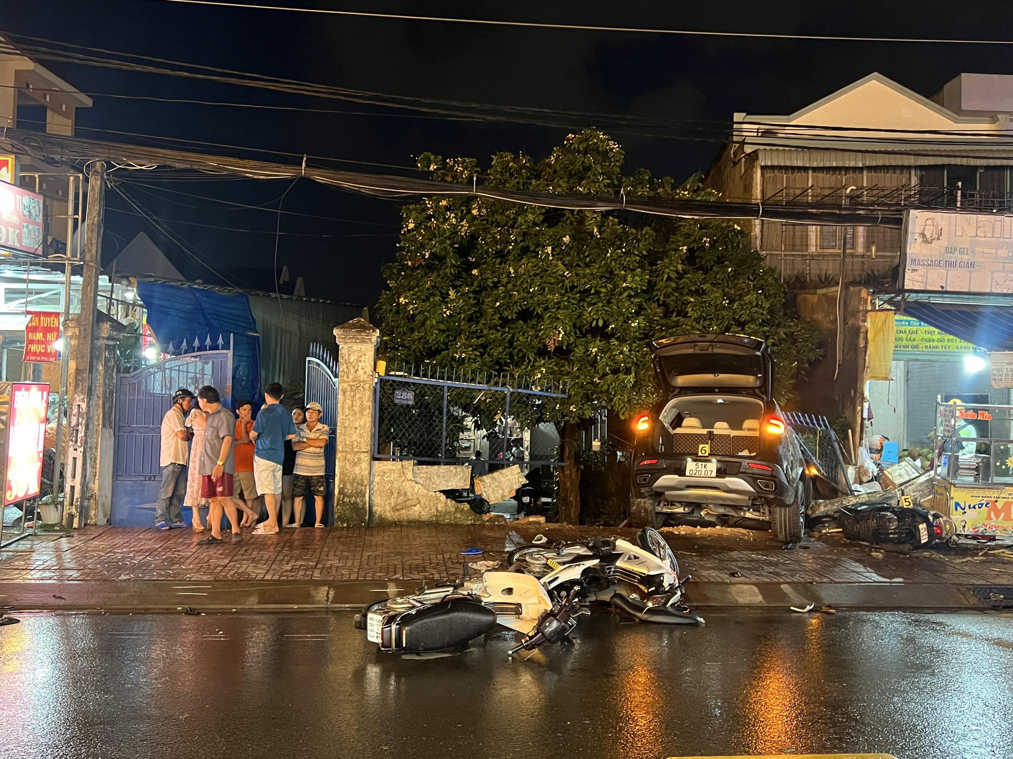 Ô tô tiếp tục lao sang làn đường ngược chiều rồi tông liên tiếp 3 xe máy, lao lên vỉa hè tông một xe máy khác đang đậu ở đây và húc sập tường, lao xuống sân nhà dân.