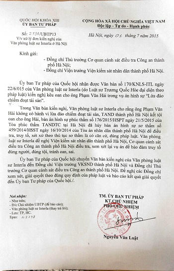 Bên cạnh đó, các luật sư bào chữa cho ông Hải cũng đã nhiều lần gửi đơn kiến nghị đến cơ quan có thẩm quyền để chứng minh ông Hải vô tội. Đặc biệt, ngày 01/7/2015, Ủy ban Tư pháp Quốc hội đã có công văn số 2798/UBTP13 gửi đến Cơ quan CSĐT – Công an TP Hà Nội và VKSND TP Hà Nội yêu cầu xem xét, giải quyết theo đúng quy định của pháp luật và báo cáo kết quả giải quyết đến Ủy ban Tư pháp của Quốc Hội./.