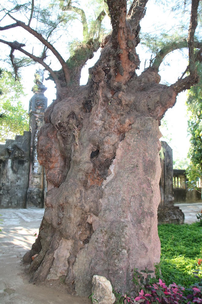 Có điều đặc biệt, dù thuộc hàng đại thụ trong vườn nhưng cây phi lao vẫn xanh tốt, cành lá tỏa bóng che phủ cả góc vườn. Các bậc cao niên sống gần chùa cho biết, họ lớn lên đã thấy cây phi lao đứng sừng sững, chẳng khác bây giờ là mấy. Nhiều người tin rằng cây phi lao có từ ngày ngôi chùa được xây dựng cách đây 335 năm.