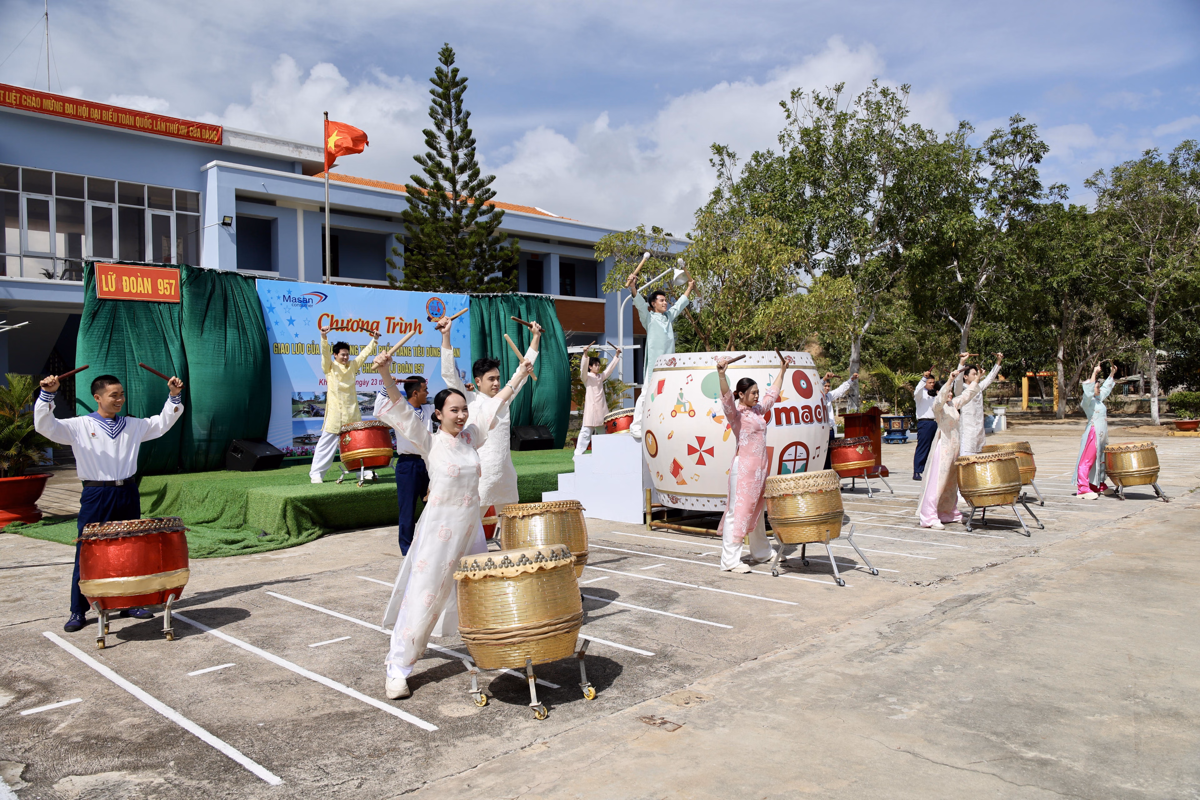 Tiết mục trống được trình diễn bởi sự kết hợp ăn ý giữa các chiến sĩ của Lữ đoàn 957 cùng các nghệ sĩ đã tạo nên một dòng chảy cảm xúc liền mạch, nơi quân và dân cùng hòa chung một nhịp. Tiếng trống hội rộn ràng và lời chúc mùa xuân đổi mới đã tiếp thêm năng lượng và niềm tin cho những người đang ngày đêm gìn giữ biển trời Tổ quốc.