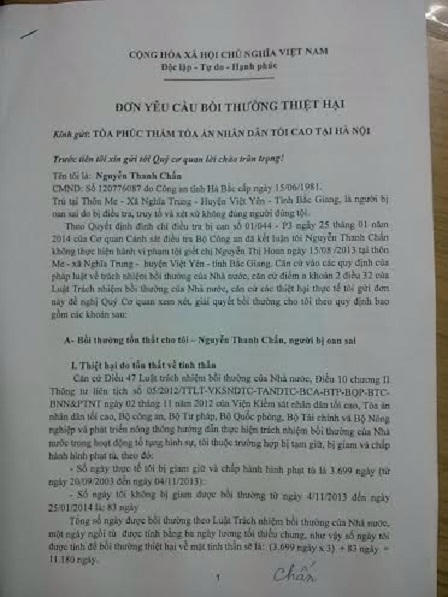 Ông Nguyễn Thanh Chấn cho rằng, thời gian bị tù oan 10 năm đã gây ảnh hưởng lớn đến tinh thần, sức khỏe, cũng như cuộc sống của ông. Vì vậy, ông Chấn đã làm đơn và hồ sơ gửi đến Tòa phúc thẩm Tòa án Nhân dân Tối cao tại Hà Nội yêu cầu bồi thường oan sai.