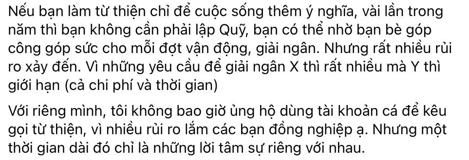 Nhưng từ thực tế, có lần nào mà điều tốt đẹp ấy thật ấm êm? Không chỉ người trong cuộc, mà người ngoài cuộc cũng không yên, đau buồn cho tất cả. Trong status này tôi muốn nói rằng: Các bạn đồng nghiệp của tôi ơi, hãy tự bảo vệ mình. Hơn ai hết, tôi rất đồng cảm và hiểu được nỗi niềm của các bạn, các bạn cũng như tôi, nhưng hãy tìm cách bảo vệ mình trước khi bắt đầu một hành trình, cho dù đó là một hành trình nhân ái cao đẹp.”