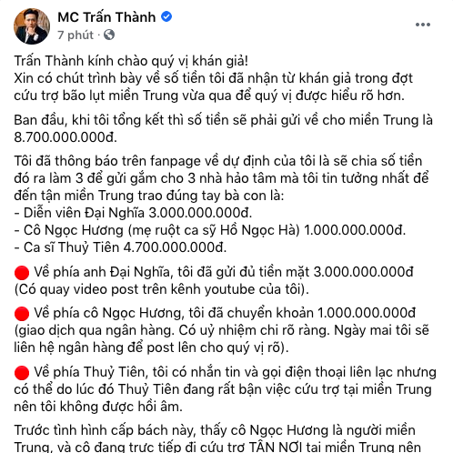 Theo Trấn Thành, vì nhiều lần liên lạc Thủy Tiên không được do lúc đó nữ ca sĩ khá bận với việc cứu trợ tại miền Trung nên anh đã có quyết định chuyển thêm tiền cho các nhà hỗ trợ khác để trao tận tay cho người dân.
