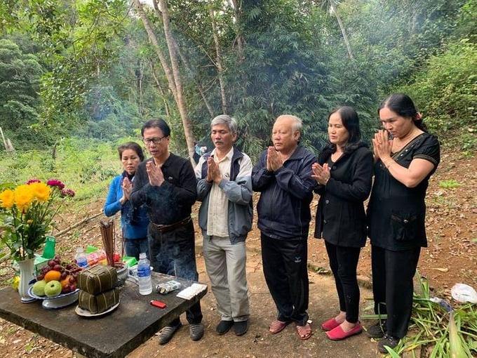 Ông Mẫn và vợ (ngoài cùng bên trái) thắp hương tưởng niệm liệt sĩ ở lòng hồ Daklop huyện Kbang, Gia Lai năm 2018. Ở đây, năm 2002, gia đình ông đã tìn thấy 8 hài cốt liệt sĩ. Ảnh nhân vật cung cấp.