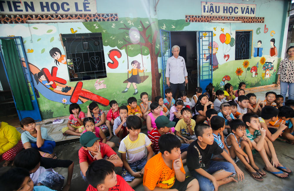 “Hồi ấy, ở vùng này hoang vắng lắm, dân cư thưa thớt, chủ yếu là dân nghèo ở các tỉnh về đây làm công nhân. Quanh đây, có 5 cái lò gạch nên nhiều người đến ở, làm thuê. Họ nghèo làm gì có tiền cho con đến lớp. Vả lại, muốn đến lớp cũng khó vì giấy tờ, hồ sơ. Bà nhà tôi thấy những đứa trẻ cứ lang thang, chơi bời. Lớn lên lại không nghề nghiệp, có đứa còn rơi vào con đường lao lý. Với tấm lòng là một giáo viên, bà nhà tôi quyết mở lớp học tình thương”, ông Tư kể.