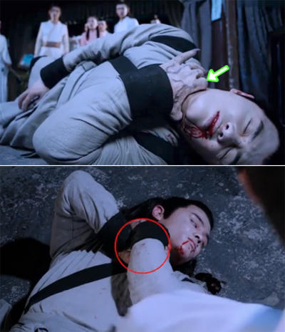 Khi chết (ảnh trên), một tay nhân vật đặt trên cổ nhưng ở góc quay sau đó, nhân vật để hai tay lên cổ. |