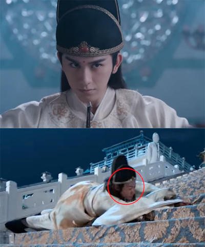 Phục sức trên đầu Lam Vọng Cơ (trái, Vương Nhất Bác đóng) biến mất ở một cảnh quay, tóc nhân vật cũng xoăn hơn. |
