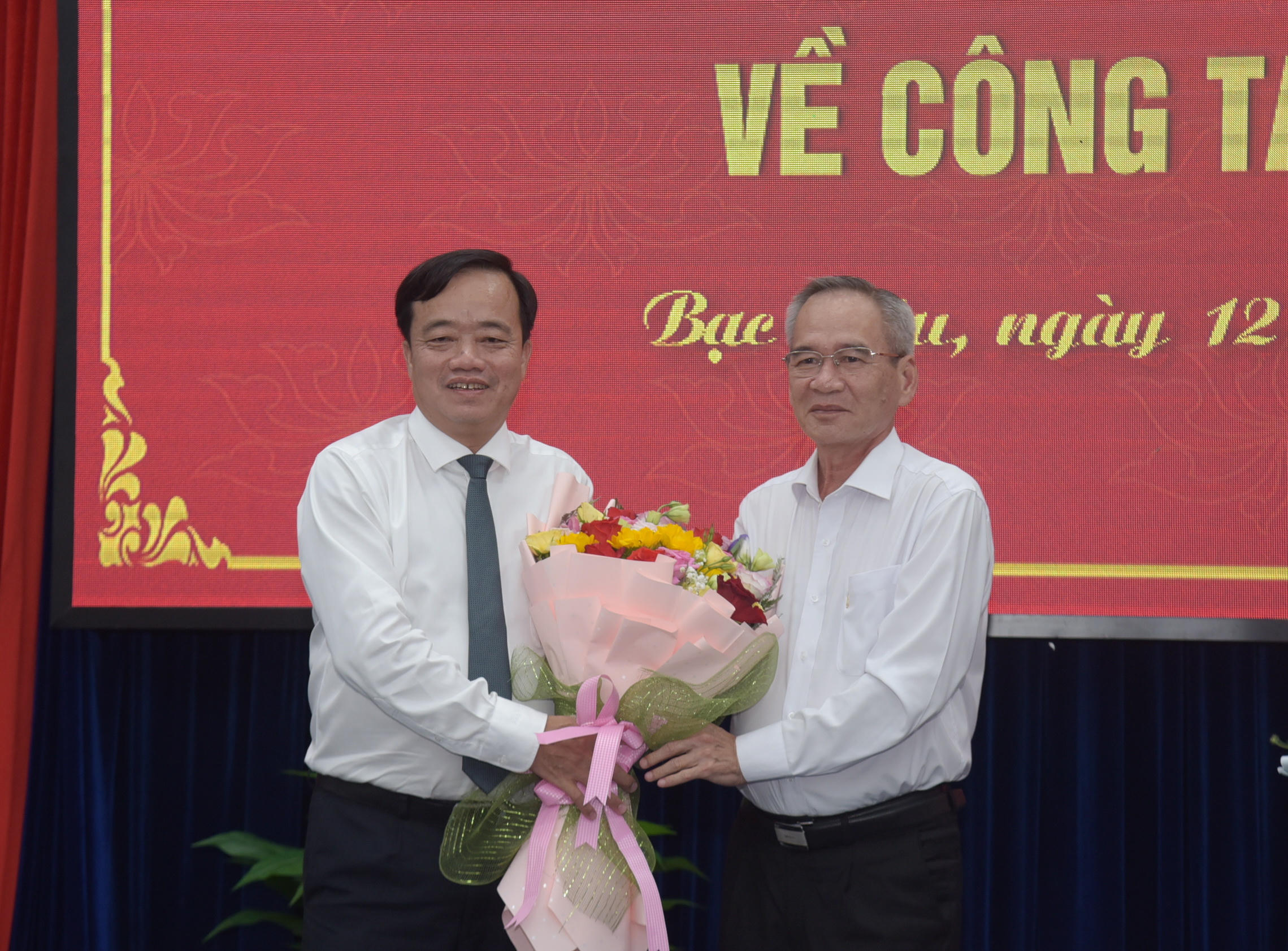 Ông Lữ Văn Hùng - Ủy viên BCH TW Đảng, Bí thư Tỉnh ủy, Chủ tịch HĐND tỉnh Bạc Liêu (bên phải) tặng hoa chúc mừng ông Huỳnh Quốc Việt - Phó Bí thư Tỉnh ủy Bạc Liêu. |