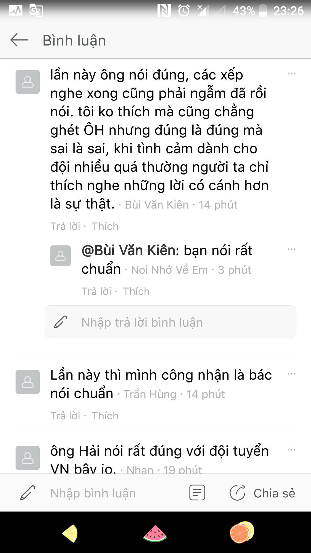 Bạn đọc có nick Lãng tử phong lưu bày tỏ: “Tôi là người hâm mộ và theo dõi rất sát sao bóng đá Việt Nam từ cấp U cho đến đội tuyển quốc gia. Tôi cũng đọc rất nhiều bình luận và phân tích của ông Hải và nhiều bài bình luận tôi cũng không hài lòng, nhưng lần này theo tôi nhìn nhận và phân tích của ông Hải tôi thấy rất đúng.