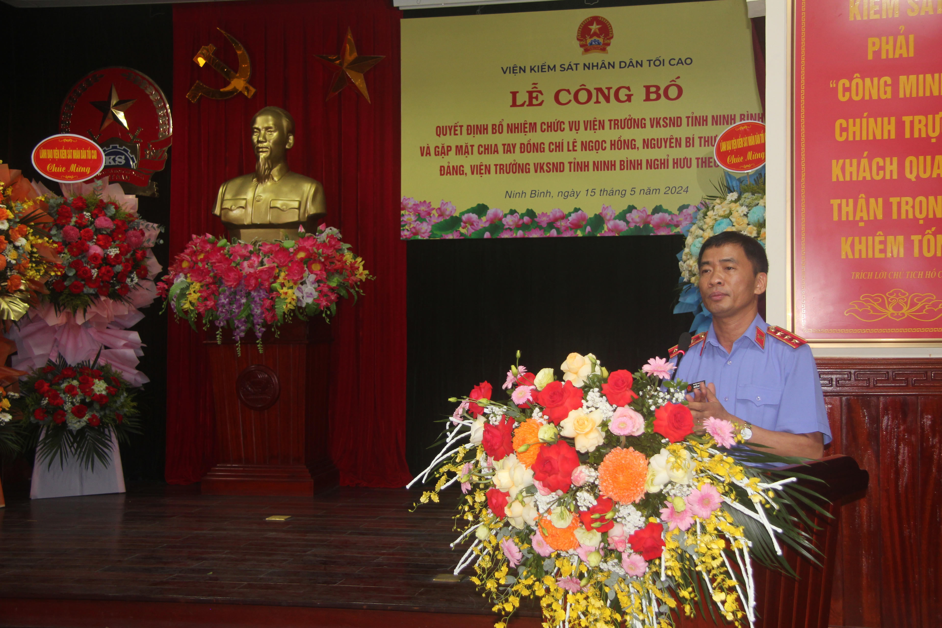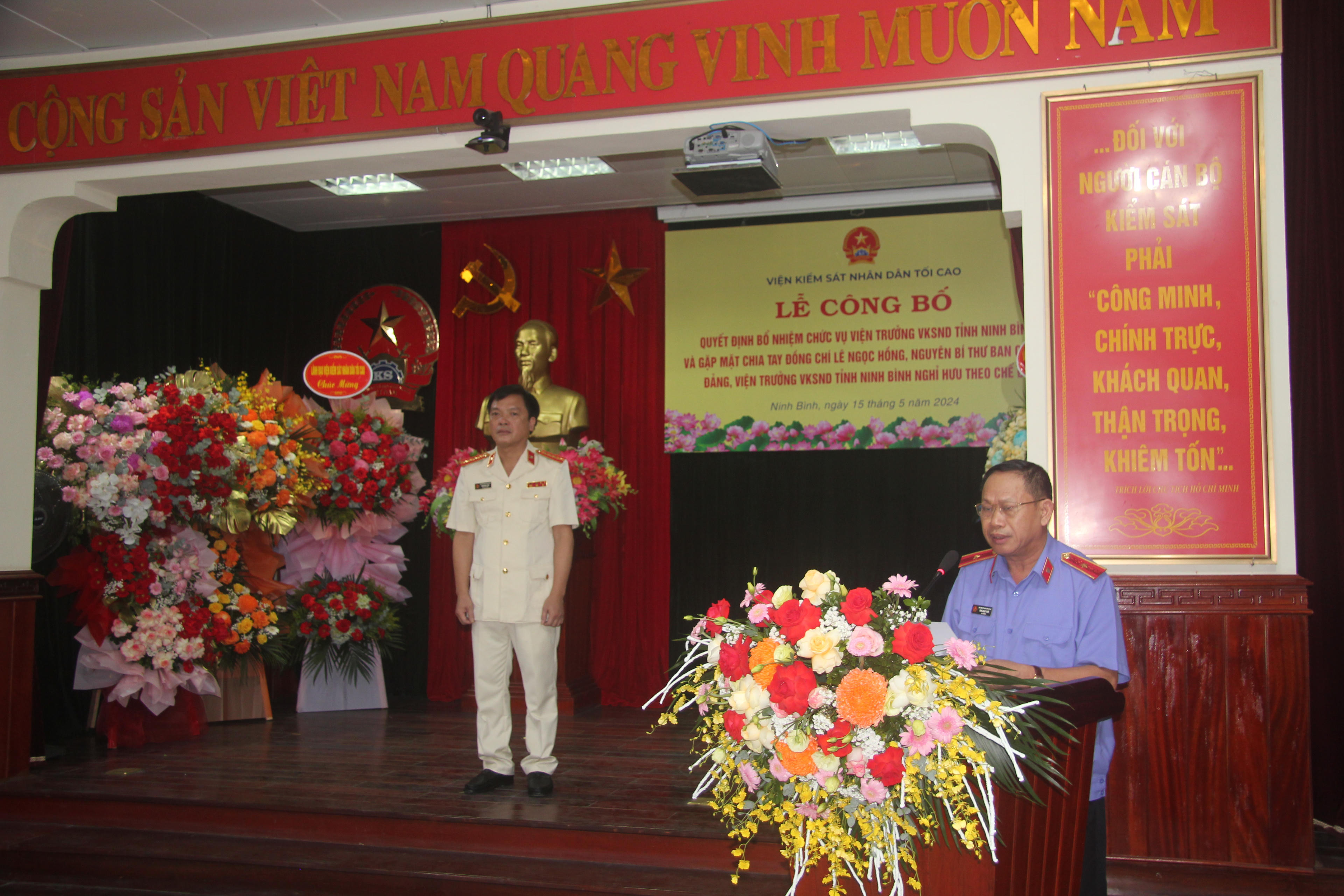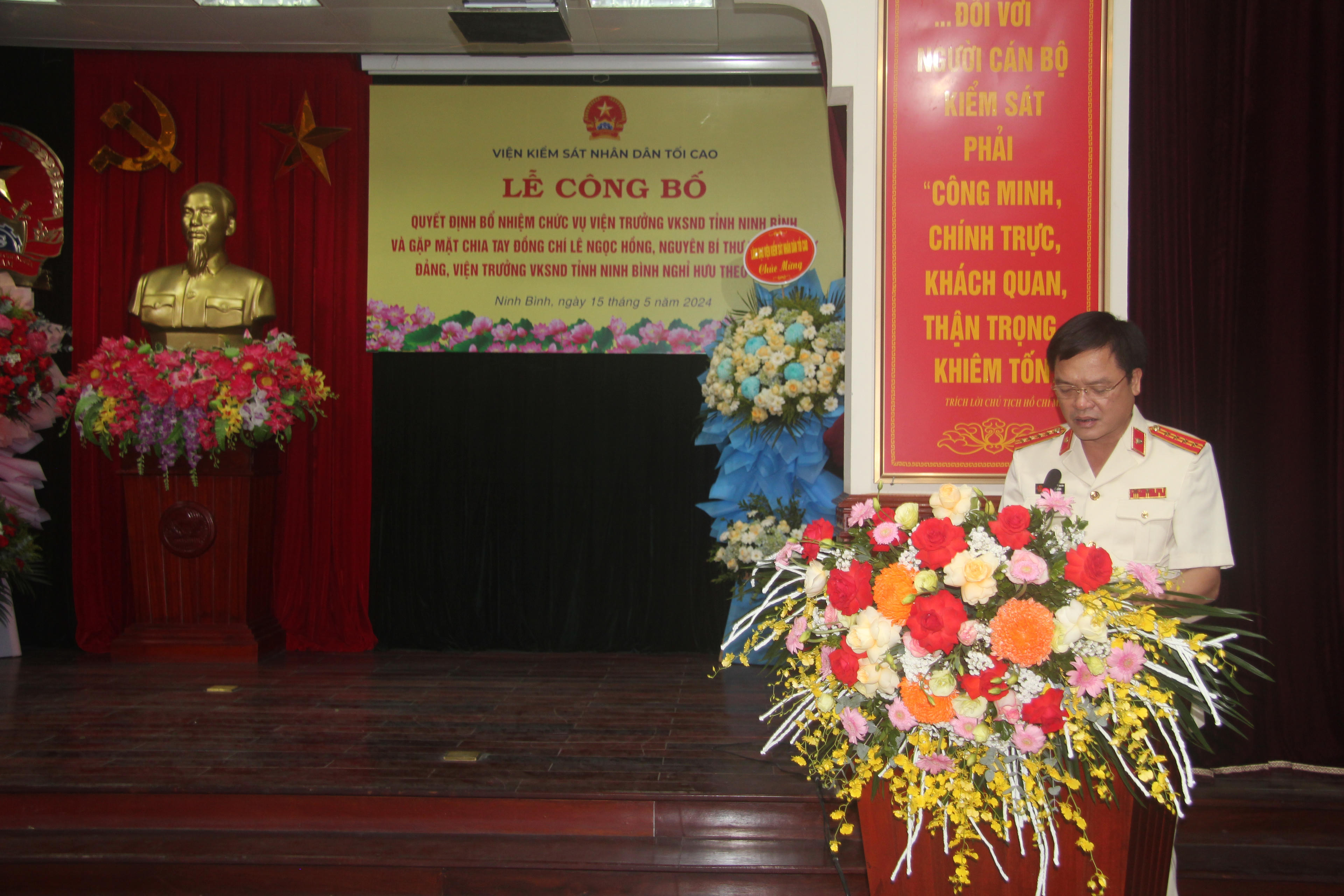 Tại buổi Lễ, ông Tăng Ngọc Tuấn - Vụ trưởng Vụ Tổ chức cán bộ VKSND tối cao công bố Quyết định số 55/QĐ-VKSTC ngày 8/5/2024 của Viện trưởng VKSND tối cao điều động, bổ nhiệm ông Phạm Ngọc Cảnh giữ chức vụ Viện trưởng VKSND tỉnh Ninh Bình, thời hạn 5 năm, kể từ ngày 16/5/2024.