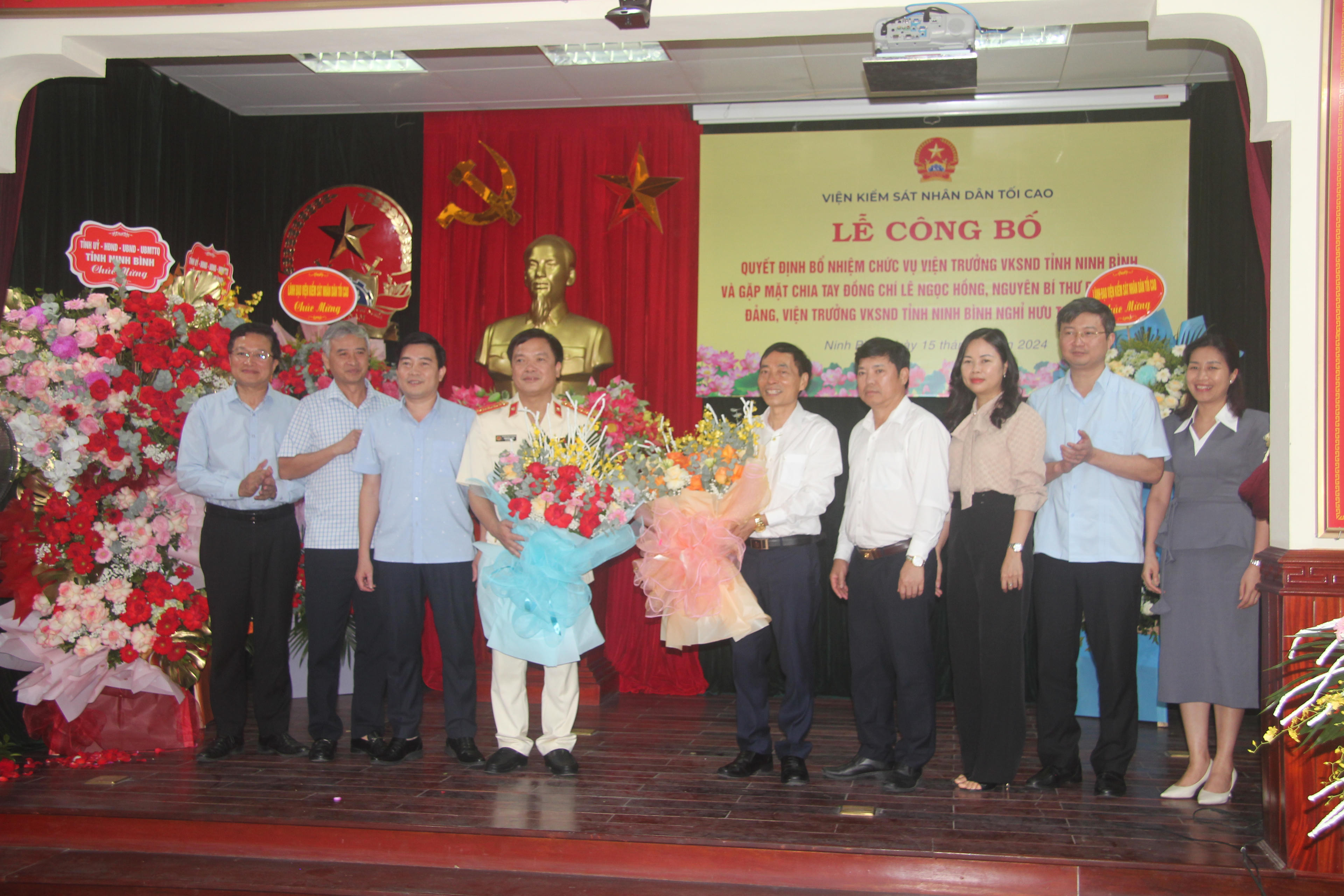 Lãnh đạo Công an tỉnh Ninh Bình tặng hoa chúc mừng tân Viện trưởng. |