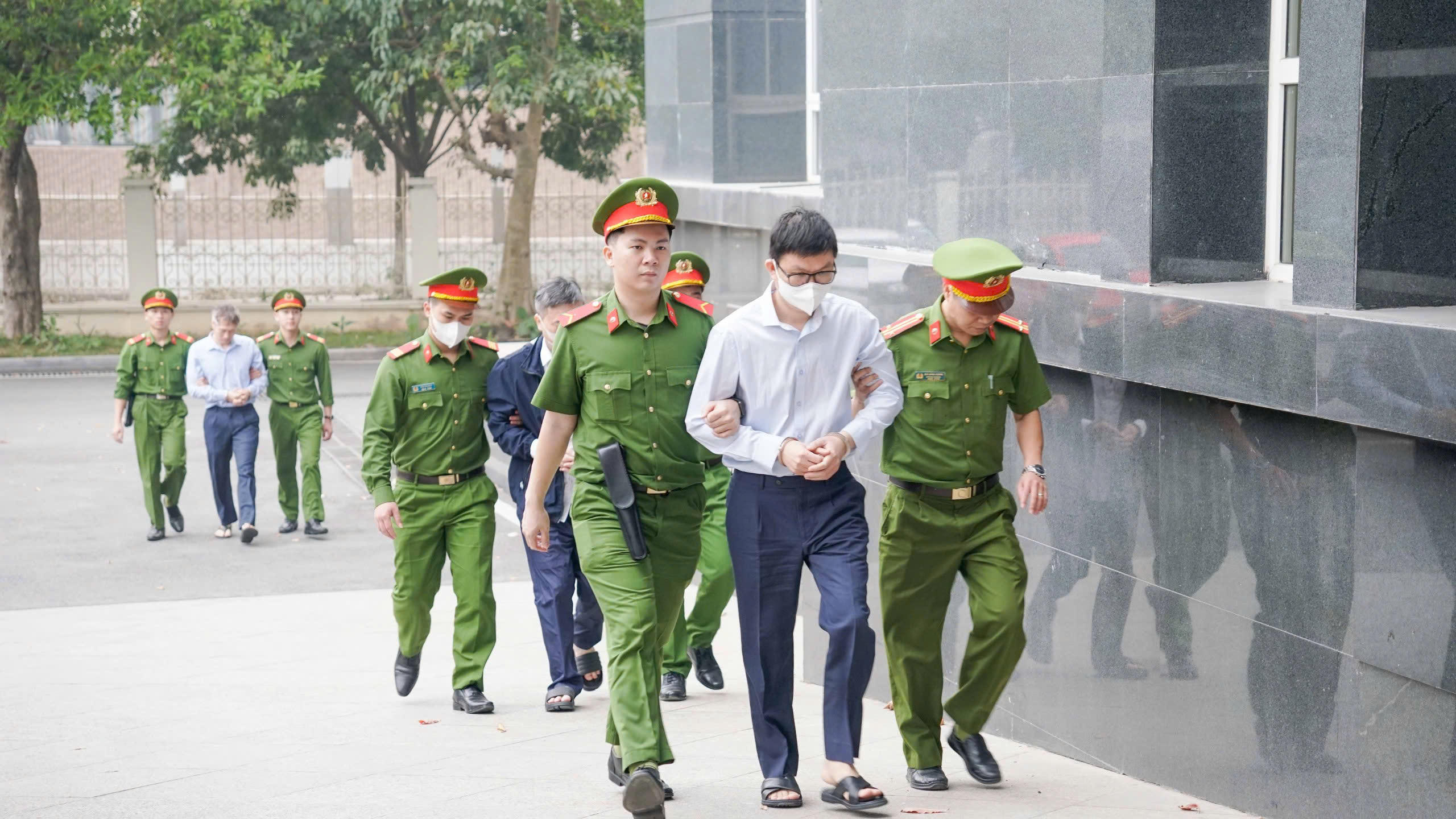 Khoảng 7h30, các bị cáo bắt đầu được dẫn giải tới phiên tòa. Bị hại, người liên quan, người nhà bị cáo cũng làm thủ tục vào phòng xét xử.