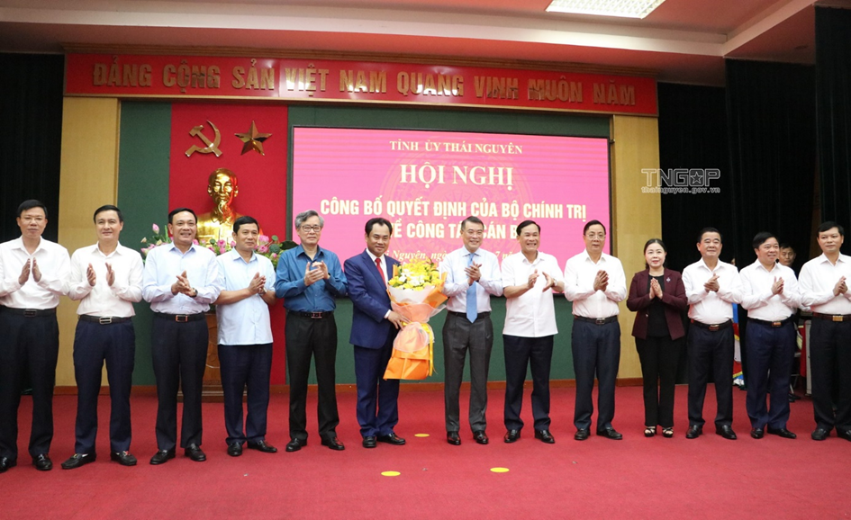 Lãnh đạo Ban Tổ chức Trung ương và Ban Thường vụ Tỉnh ủy Thái Nguyên tặng hoa chúc mừng tân Bí thư Tỉnh ủy Trịnh Việt Hùng |