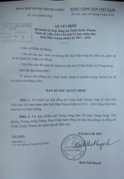 Thông báo của Tỉnh ủy Hậu Giang về việc này cho biết, vào 14h chiều nay, Đoàn kiểm tra của UB Kiểm tra Trung ương đã công bố Quyết định số 355-QĐNS/TW ngày 9/9/2016 của Ban Bí thư về việc thi hành kỷ luật đồng chí Trịnh Xuân Thanh, Tỉnh ủy viên, Phó chủ tịch UBND tỉnh Hậu Giang nhiệm kỳ 2011-2016 bằng hình thức ra khỏi Đảng.