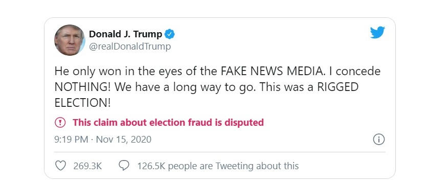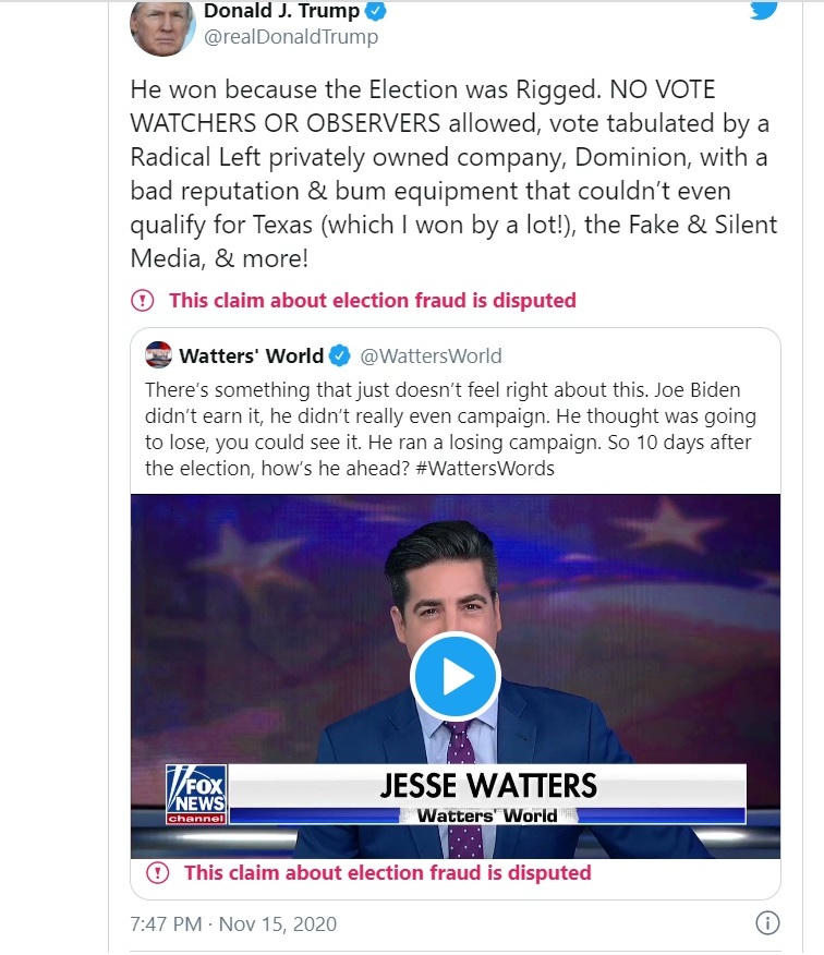 Ông Trump đã viết trên Twitter: "Ông (Biden) đã giành chiến thắng vì cuộc bầu cử có gian lận. Không có giám sát viên hay quan sát viên nào được tham gia cuộc bầu cử, cuộc bỏ phiếu đã được dàn xếp bởi một công ty tư nhân cực đoan cánh tả là Dominion - một thực thể đầy tai tiếng và sở hữu trang thiết bị hạng bét mà thậm chí không thể đủ tiêu chuẩn dành cho Texas (nơi mà tôi đã chiến thắng áp đảo). Truyền thông giả tạo và im lặng, và hơn thế nữa!"