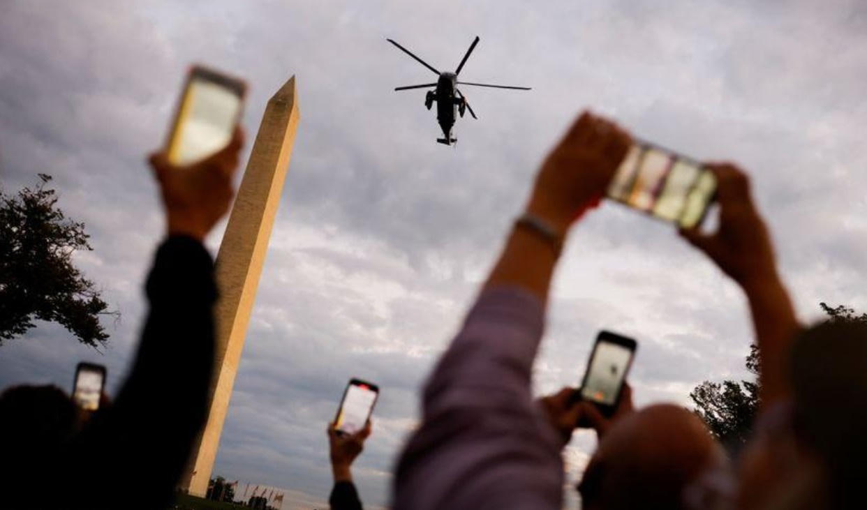 Sau đó ông Trump sau đó đã lên một chiếc SUV màu đen chở ông đến trực thăng Marine One của ông rồi bay chuyến bay ngắn 10 phút đến Nhà Trắng. Anh ấy đưa ra một biểu tượng thích ngay trước khi bước lên chiếc trực thăng.