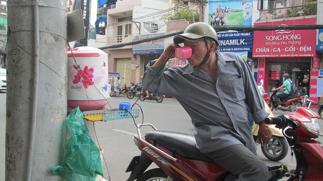 Vóc người bé nhỏ, khuôn mặt khắc khổ, nhìn ông giống với mẫu người cẩn thận, kiệm lời và chịu đựng, nhưng mỗi khi mở miệng đối đáp với người quen, câu trả lời của ông lại thật hóm hỉnh, chọc cười. Người xe ôm uống nước xong quay mặt nói với vào, giọng cà rỡn: “Lần sau cho cái ca bự để đỡ mất công vặn vòi”.