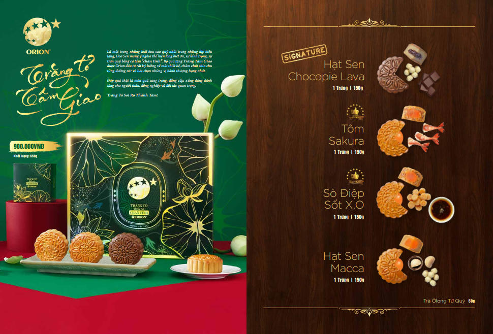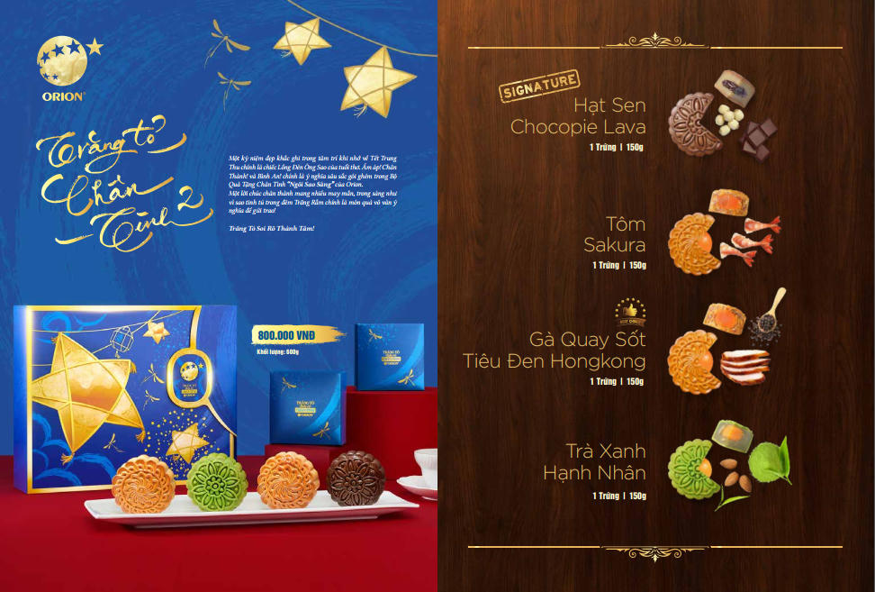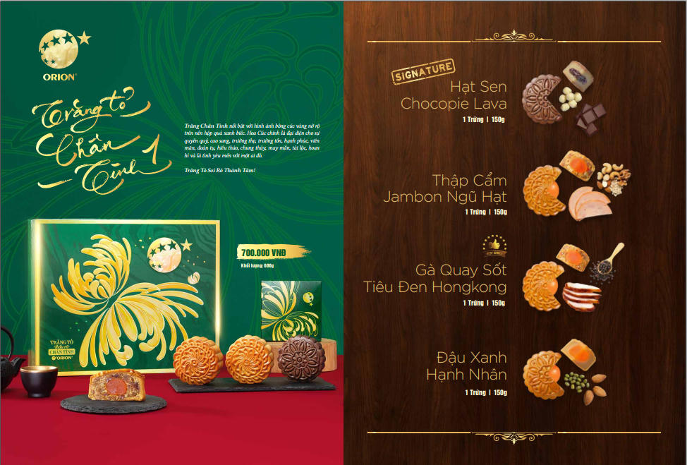 Xuất phát từ sự cảm mến văn hóa Việt Nam, Orion đã lên kế hoạch phát triển sản phẩm bánh Trung Thu. Bộ sản phẩm bánh Trung Thu của Orion mang trong mình dấu ấn của sự ‘Chân Tình’. Sản phẩm tập trung chăm chút tỉ mỉ về mặt chất lượng bánh từ việc lựa chọn nguyên liệu cho tới tạo hình, đóng gói, thiết kế bao bì, thành phẩm.