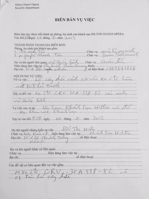 Sau đó ông Bình và Phòng an ninh của khách sạn đã lập một biên bản và chụp hình ảnh tại hiện trường vụ việc. Biên bản được lập với sự tham gia của khách hàng, đại diện khách sạn Hilton Hanoi Opera (ông Tạ Anh Tài, Quản lý an ninh; ông Nguyễn Mạnh Tân, Giám sát an ninh) và người chứng kiến vụ việc.