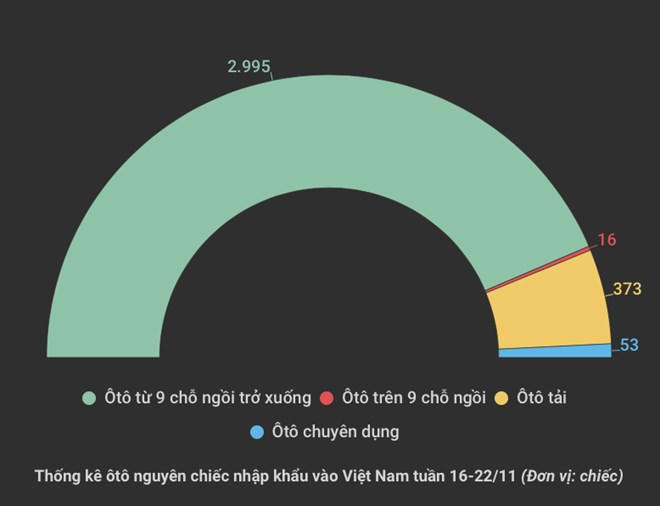 Cụ thể, lượng xe nhập khẩu trong tuần đạt 3.437 chiếc, tương ứng đạt 73,7 triệu USD. Trong khi đó, ôtô nguyên chiếc các loại nhập khẩu được Tổng cục Hải quan ghi nhận trong tuần trước (từ 9/11 đến 15/11) đạt 2.535 chiếc với tổng trị giá đạt 51,1 triệu USD.